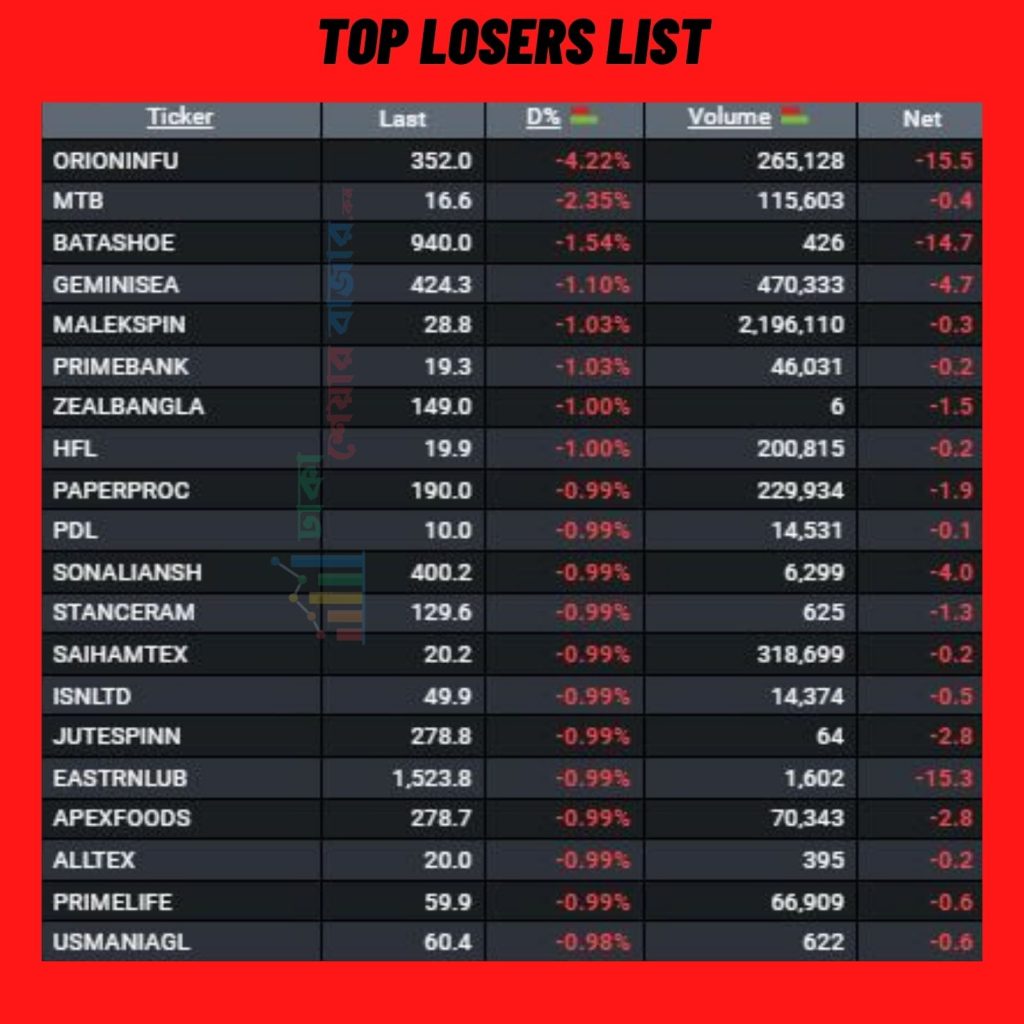 ডিএসইতে আজ দাম পতনের  শীর্ষে টপ ২০ টি শেয়ার
