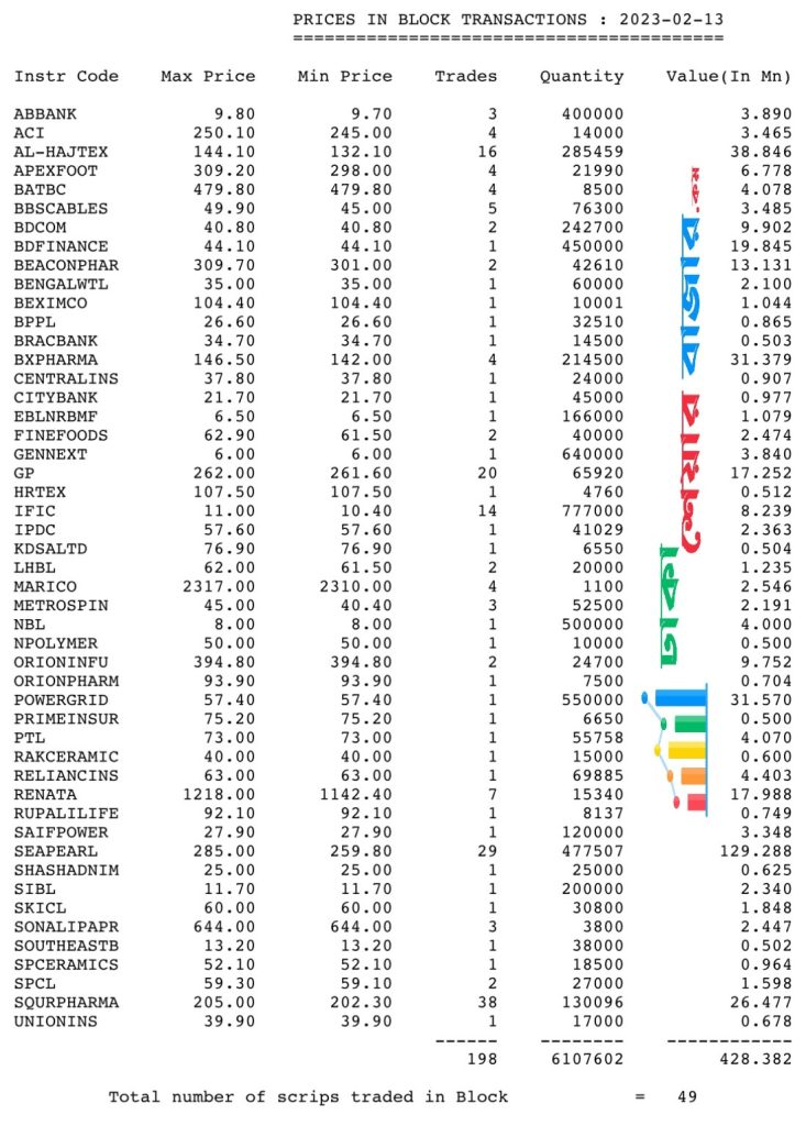 আজ ১৩ই ফেব্রুয়ারী ২০২৩ দেশের প্রধান পুঁজিবাজার ঢাকা ষ্টক এক্সচেঞ্জে ব্লক ৪৯ টি শেয়ারের মোট লেনদেন হয়েছে ৪২.৮৩ কোটি টাকা। গতকাল ব্লকে মোট ৫৮ টি কোম্পানির ট্রেড হয়েছে ৪৫.৫৯ কোটি টাকা। আজ ব্লকে গত দিনের চেয়ে লেনদেন কম হয়েছে ২.৭৬ কোটি টাকা।