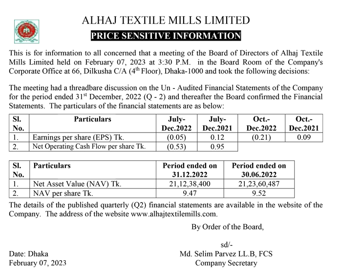পুঁজিবাজারে তালিকাভুক্ত বস্ত্র খাতের কোম্পানি আলহাজ্ব টেক্সটাইল মিলস লিমিটেডের(AL-HAJTEX) চলতি অর্থবছরের ২য় প্রান্তিকের (অক্টোবর ২০২২-ডিসেম্বর২০২২) ও (জুলাই ২০২২-ডিসেম্বর২০২২) অনিরীক্ষিত আর্থিক প্রতিবেদন প্রকাশ করেছে।
