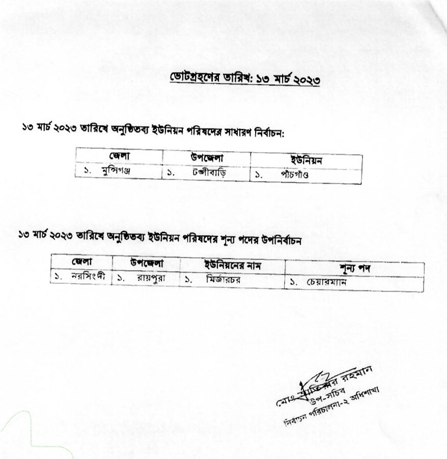 জানা যায়, সোমবার (১৩ মার্চ) মুন্সিগঞ্জ জেলার পাঁচগাঁও ইউনিয়ন পরিষদের সাধারণ নির্বাচন এবং নরসিংদী জেলার মির্জারচর ইউনিয়ন পরিষদের উপনির্বাচন অনুষ্ঠিত হবে।