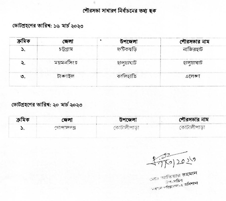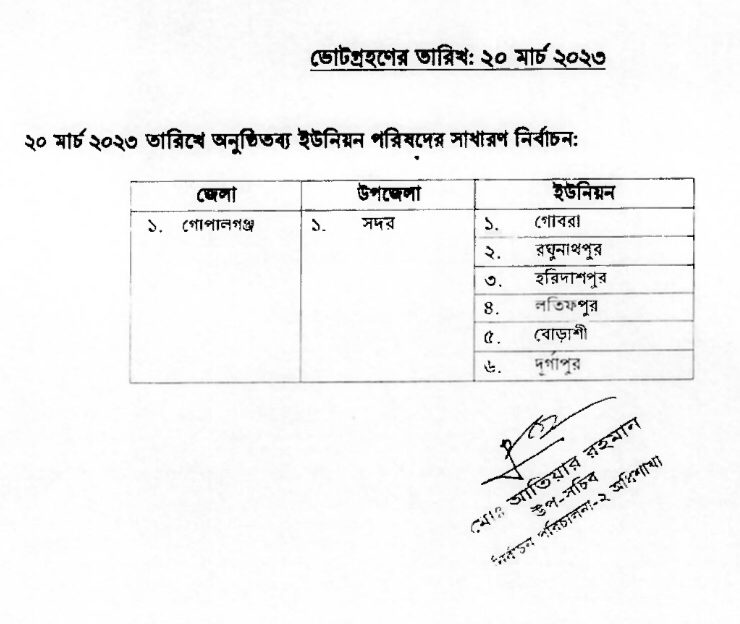 এছাড়া ২০ মার্চ গোপালগঞ্জের সদর উপজেলার হরিদাশপুর সহ ছয় ইউনিয়নে সাধারণ নির্বাচন অনুষ্ঠিত হবে।