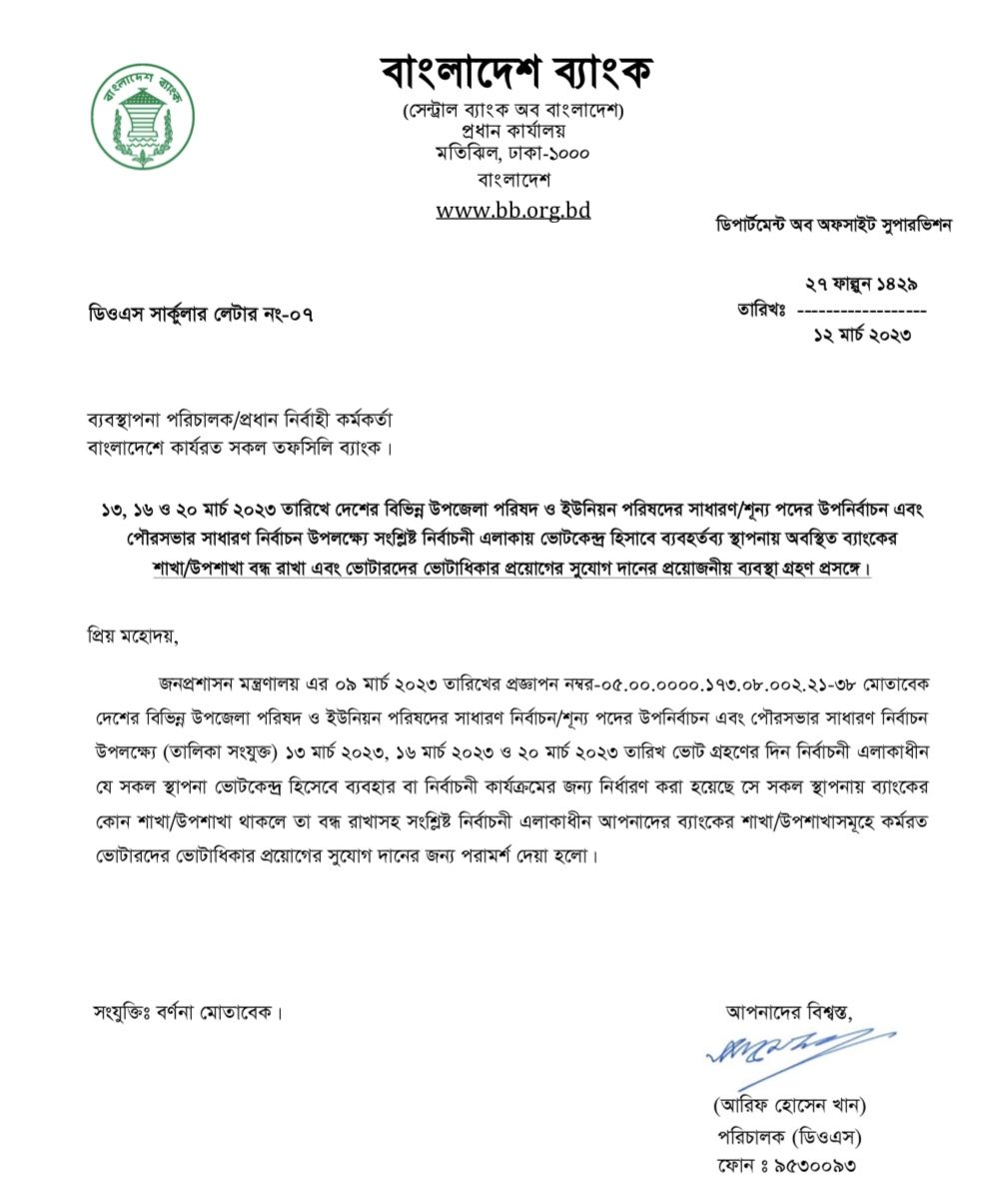 এতে বলা হয়, চলতি মাসের ১৩, ১৬ ও ২০ মার্চ দেশের বিভিন্ন উপজেলা ও ইউনিয়ন পরিষদ নির্বাচন ও শূন্য পদের উপনির্বাচন এবং বিভিন্ন পৌরসভার সাধারণ নির্বাচন অনুষ্ঠিত হবে। এ উপলক্ষ্যে সংশ্লিষ্ট নির্বাচনী এলাকায় ভোট কেন্দ্র হিসাবে ব্যবহার করা হয় এমন স্থাপনায় ব্যাংকের যেসব শাখা বা উপশাখা রয়েছে তা বন্ধ রাখতে হবে। একই সঙ্গে ভোটারদের ভোটাধিকার প্রয়োগের সুযোগ দানের প্রয়োজনীয় ব্যবস্থা গ্রহণ করতে বলা হয়েছে।