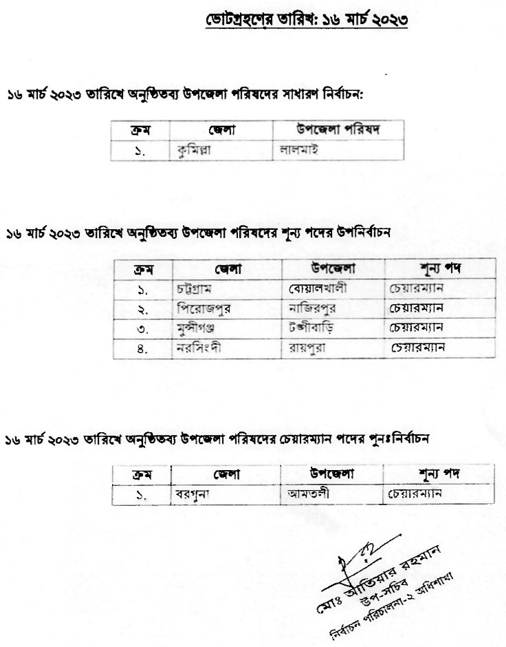 একই দিনে চট্রগ্রাম জেলার বোয়ালখালী, পিরোজপুর জেলার নাজিরপুর, মুন্সীগঞ্জ জেলার টঙ্গিবাড়ী এবং নরসিংদী জেলার রায়পুরা উপজেলা পরিষদের উপনির্বাচন অনুষ্ঠিত হবে। সেদিন বরগুনা জেলার আমতলি উপজেলায় পুঃননির্বাচন অনুষ্ঠিত হবে।