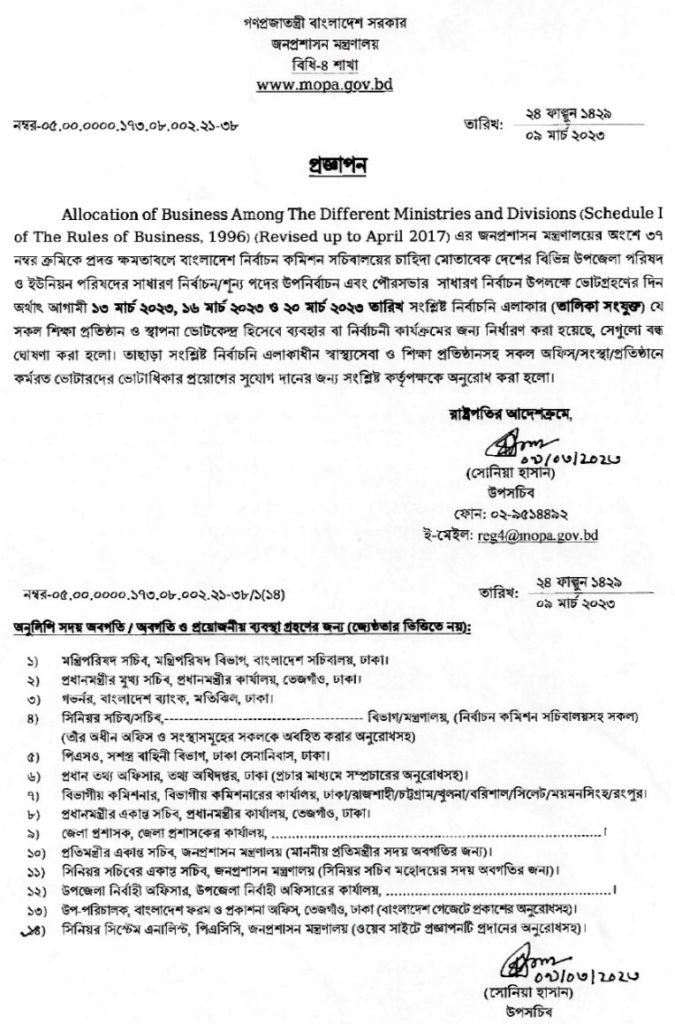 আগামীকাল সোমবার ১৩ মার্চ, ১৬ মার্চ ও ২০ মার্চ বাংলাদেশের বিভিন্ন উপজেলা,ইউনিয়ন পরিষদ নির্বাচন ও শূন্য পদের উপনির্বাচন এবং বিভিন্ন পৌরসভার সাধারণ নির্বাচন অনুষ্ঠিত হবে। নির্বাচন উপলক্ষ্যে এই তিন দিন সংশ্লিষ্ট নির্বাচনী এলাকার ব্যাংক গুলোর সব শাখা বন্ধ থাকবে।