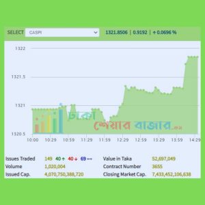 অপর দিকে দেশের ২য় শেয়ার বাজার চট্টগ্রাম স্টক এক্সচেঞ্জে (সিএসই) সূচক নাম মাত্র বাড়লেও লেনদেন গতদিনের চেয়ে কম লেনদেন হয়েছে। সিএসই সার্বিক সূচক সিএএসপিআই ০.৭০ পয়েন্ট বেড়ে সূচক অবস্থান করছে ১৮৩২১.৬৩ পয়েন্টে।