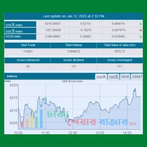 লেনদেনে আজ মূল সূচক ডিএসইএক্স সূচক ৫.৫২ পয়েন্ট বেড়ে, অবস্থান করছে ৬২১৫.০৪ পয়েন্টে। এছাড়া ডিএসইএস বা শরীয়াহ সূচক ০.১০ পয়েন্ট কমে অবস্থান করছে ১৩৫৭.৫৮ পয়েন্টে। ডিএস ৩০ সূচক ০.২৮ পয়েন্ট বেড়ে দাঁড়িয়েছে ২১৯৯.০৪ পয়েন্টে।