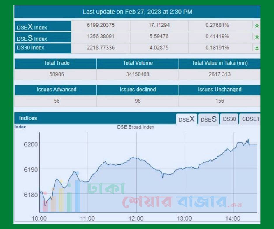 আজ সোমবার ২৭ ফেব্রুয়ারী ২০২৩, ঢাকা  স্টক এক্সচেঞ্জ ও চট্রগাম স্টক এক্সচেঞ্জ উভয়েরই সূচক ও লেনদেন গত দিনের চেয়ে বেড়েছে।