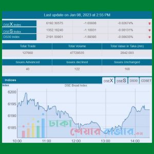 আজ রবিবার , ৮ জানুয়ারী  ২০২৩, দেশের প্রধান পুঁজিবাজার ঢাকা স্টক এক্সচেঞ্জে (ডিএসই) মূল্য সূচক ও লেনদেন কমেছে । আজ ডিএসইতে টাকার অংকে লেনদেন গতদিনের চেয়ে কমেছে । আজ ডিএসইতে মোট লেনদেন হয়েছে ২৮৪.২০ কোটি টাকার শেয়ার।