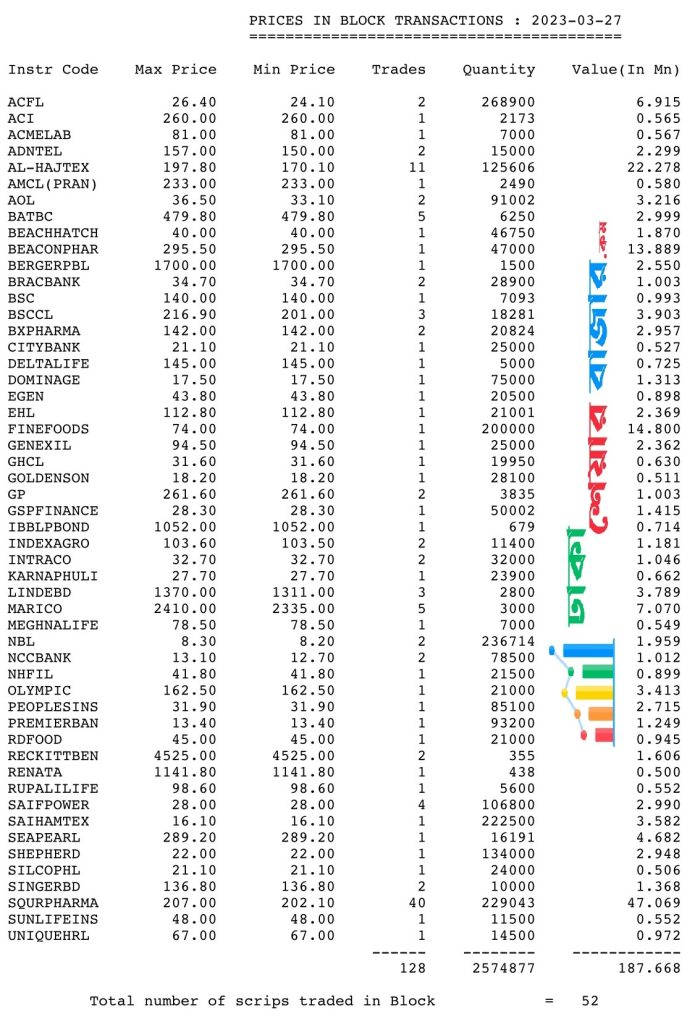 আজ ২৭ শে মার্চ ২০২৩, দেশের প্রধান পুঁজিবাজার ঢাকা ষ্টক এক্সচেঞ্জে ব্লকে ৫২ টি শেয়ারের মোট লেনদেন হয়েছে ১৮.৭৬ কোটি টাকা। গত কার্যদিবসে ব্লকে মোট ৪৯ টি কোম্পানির ট্রেড হয়েছিল ৩৭.২৭ কোটি টাকা। আজ ব্লকে গত দিনের চেয়ে লেনদেন কম হয়েছে ১৮.৫১ কোটি টাকা।