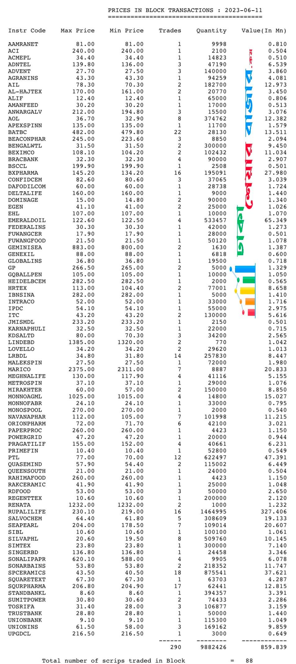 আজ ব্লকে টাকার অংকে সবচেয়ে বেশি লেনদেন রুপালী লাইফ ইন্সুইরেন্সের, আজ কোম্পানিটির ৩২ কোটি ৭৪ লাখ টাকার শেয়ার লেনদেন করেছে। এরপরে বেশি লেনদেন হয়েছে এমারেল্ড অয়েলের ৬ কোটি ৫৩ লাখ টাকার শেয়ার, লেনদেন করে তালিকার দ্বিতীয় স্থানে রয়েছে।