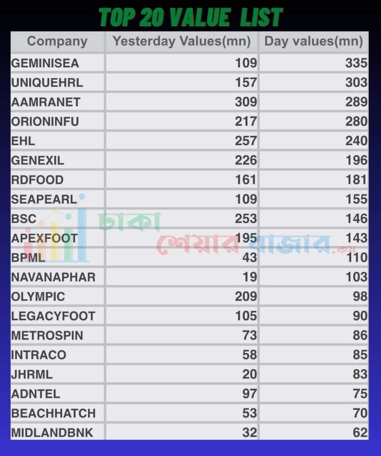 আজ শীর্ষ ২০ (ট্রেড ভ্যালু) লেনদেনের শীর্ষের তালিকায় বিভিন্ন  খাতের শেয়ার ছিল। আজশীর্ষ ২০ (ট্রেড ভ্যালু) লেনদেনের শীর্ষের তালিকায় ছিল জেমিনি সি ফুড  লিমিটেড।