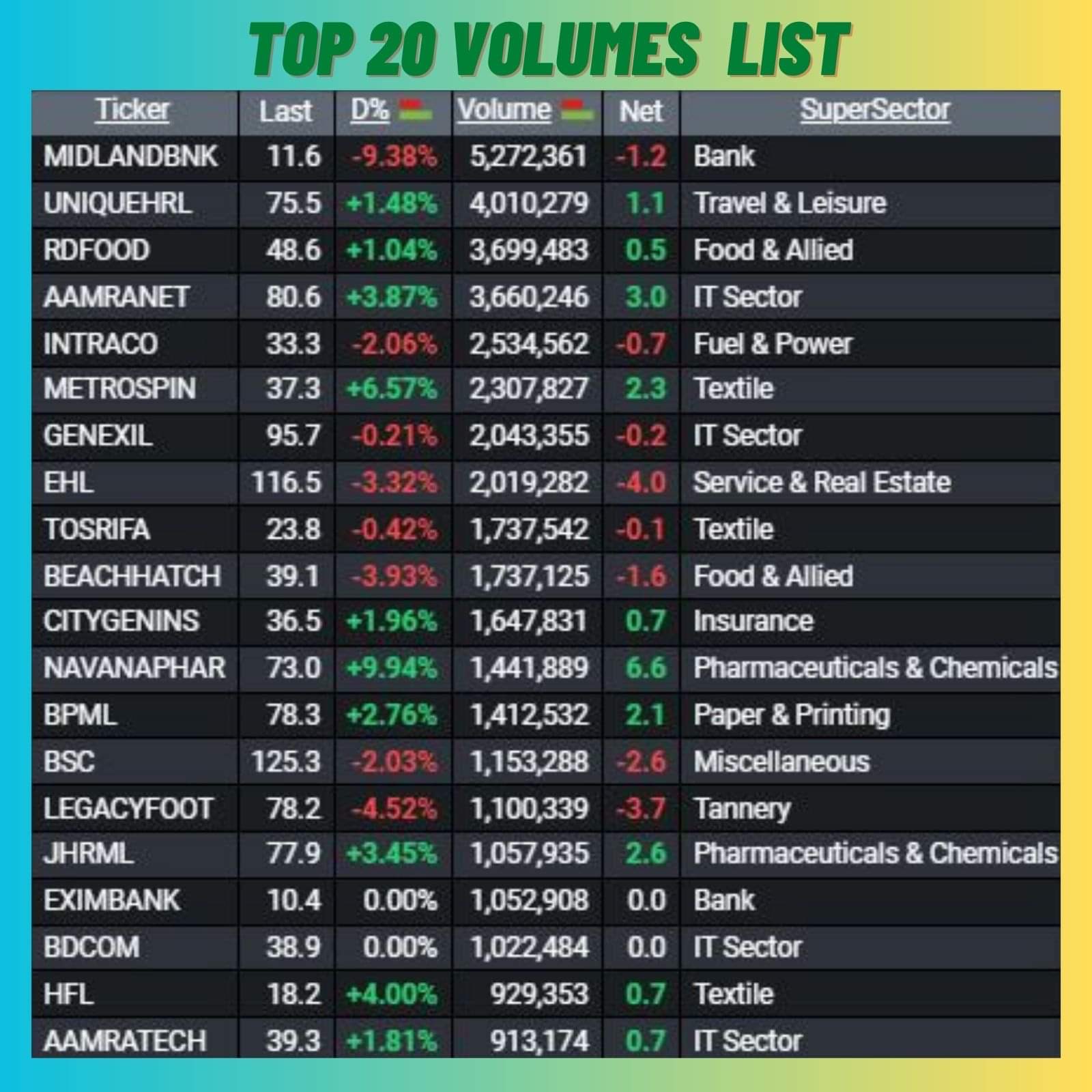 আজ শীর্ষ ২০ (ভলিউম)লেনদেনে  শেয়ারের সংখ্যার দিক দিয়ে ১১ টি খাতের শেয়ার ছিল।আজ টপ ২০ শেয়ার সংখ্যার (ভলিউম) দিক দিয়ে প্রথমে ছিল ব্যাংক খাতের মিডল্যান্ড ব্যাংক লিমিটেড।