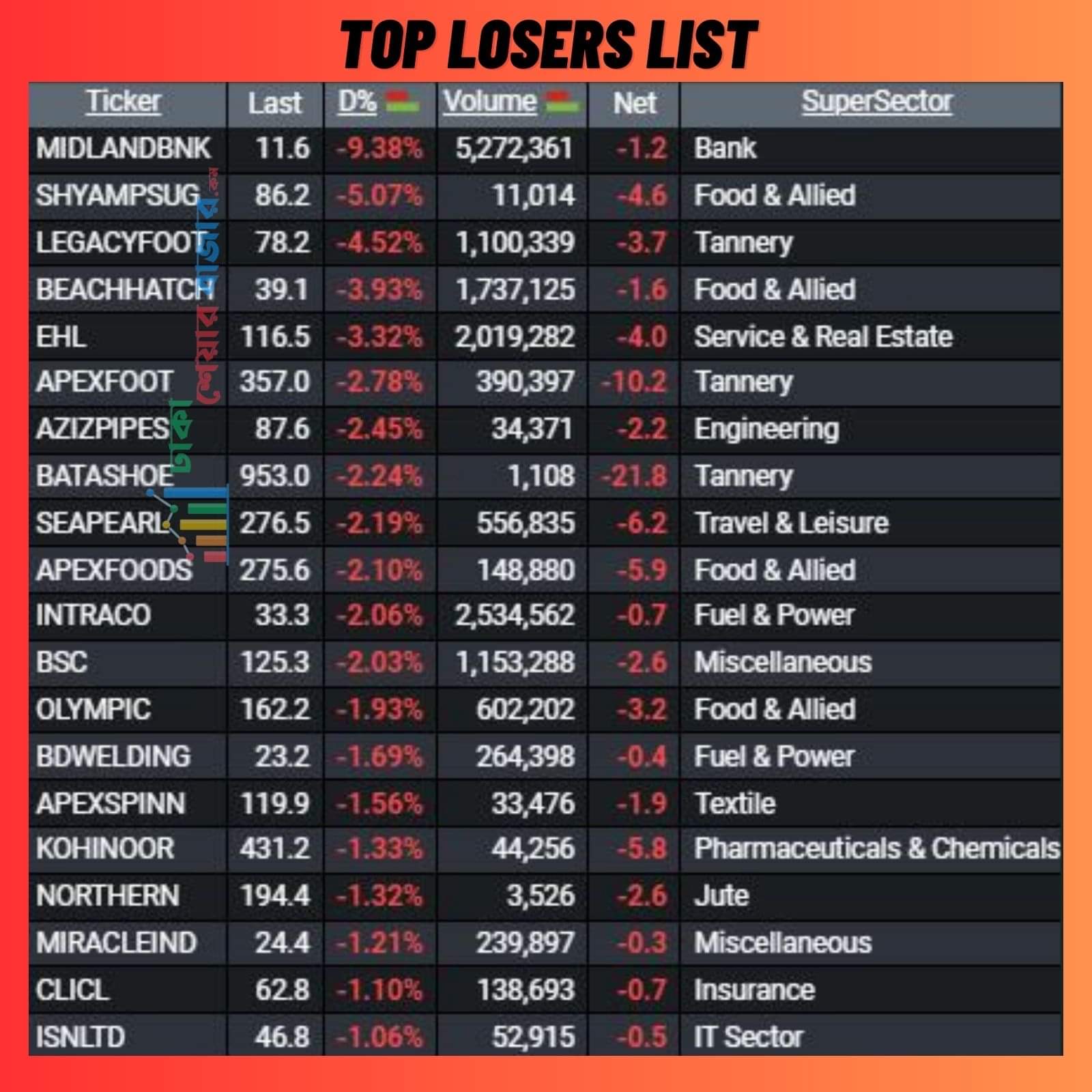 আজ শীর্ষ ২০ দাম কমার শীর্ষ তালিকায় ১২  টি খাতের শেয়ার ছিল।মিডল্যান্ড বাংক আজ কমার তালিকায় শীর্ষে ছিল।