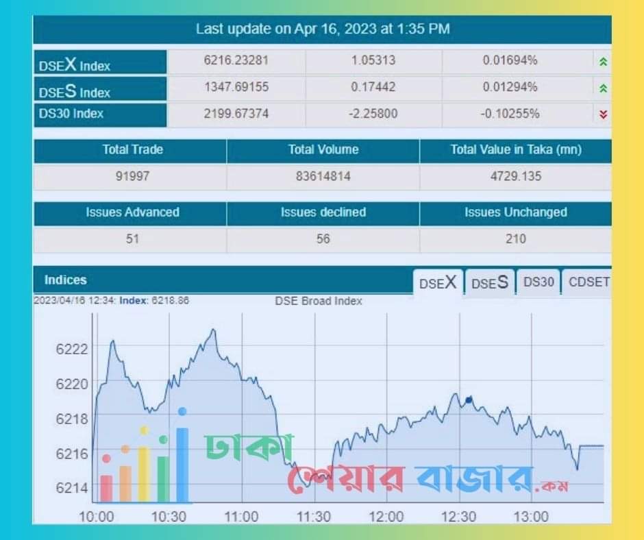 আজ রবিবার ১৬ এপ্রিল ২০২৩,  দেশের প্রধান পুঁজিবাজার ঢাকা স্টক এক্সচেঞ্জের লেনদেনের মূল সূচক লেদেন গতদিনের চেয়ে কিছুটা বেড়েছে।