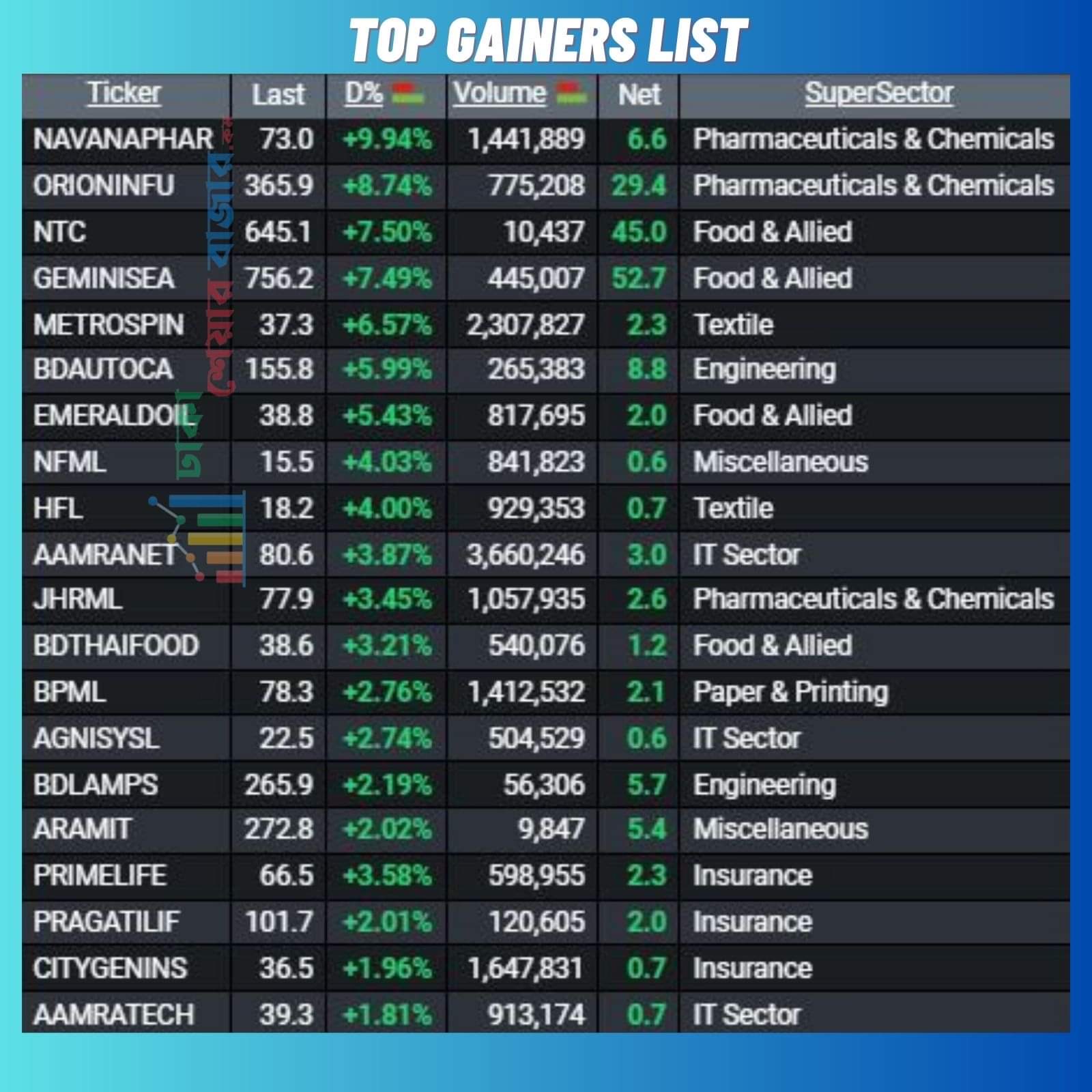 আজ শীর্ষ ২০ দাম বৃদ্ধির শীর্ষ তালিকায়   টি খাতের শেয়ার ছিল। আজ দাম বাড়ার শীর্ষে অনেক দিন পরে ফার্মাসিউটিক্যালস  খাতের টি শেয়ার উঠে এসেছে,এছাড়া আজ খাদ্য ও ইন্সুরেন্স খাতের শেয়ার  দাম বৃদ্ধির শীর্ষ তালিকায় আধিপত্য ছিল।আজ নাভানা ফার্মাসিউটিক্যালস লিমিটেড দাম বৃদ্ধির শীর্ষ তালিকায় ছিল।
