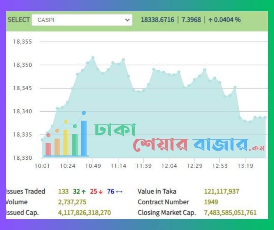 অপরদিকে দেশের ২য় শেয়ার বাজার চট্টগ্রাম স্টক এক্সচেঞ্জের (সিএসই) সূচক লেনদেন উভয়ই আজ বেড়ে  আজকের লেনদেন শেষ হয়েছে। আজ সিএসই সার্বিক সূচক সিএএসপিআই  .৭৩ পয়েন্ট বেড়ে সূচক অবস্থান করছে ১৮৩৪১. পয়েন্টে।