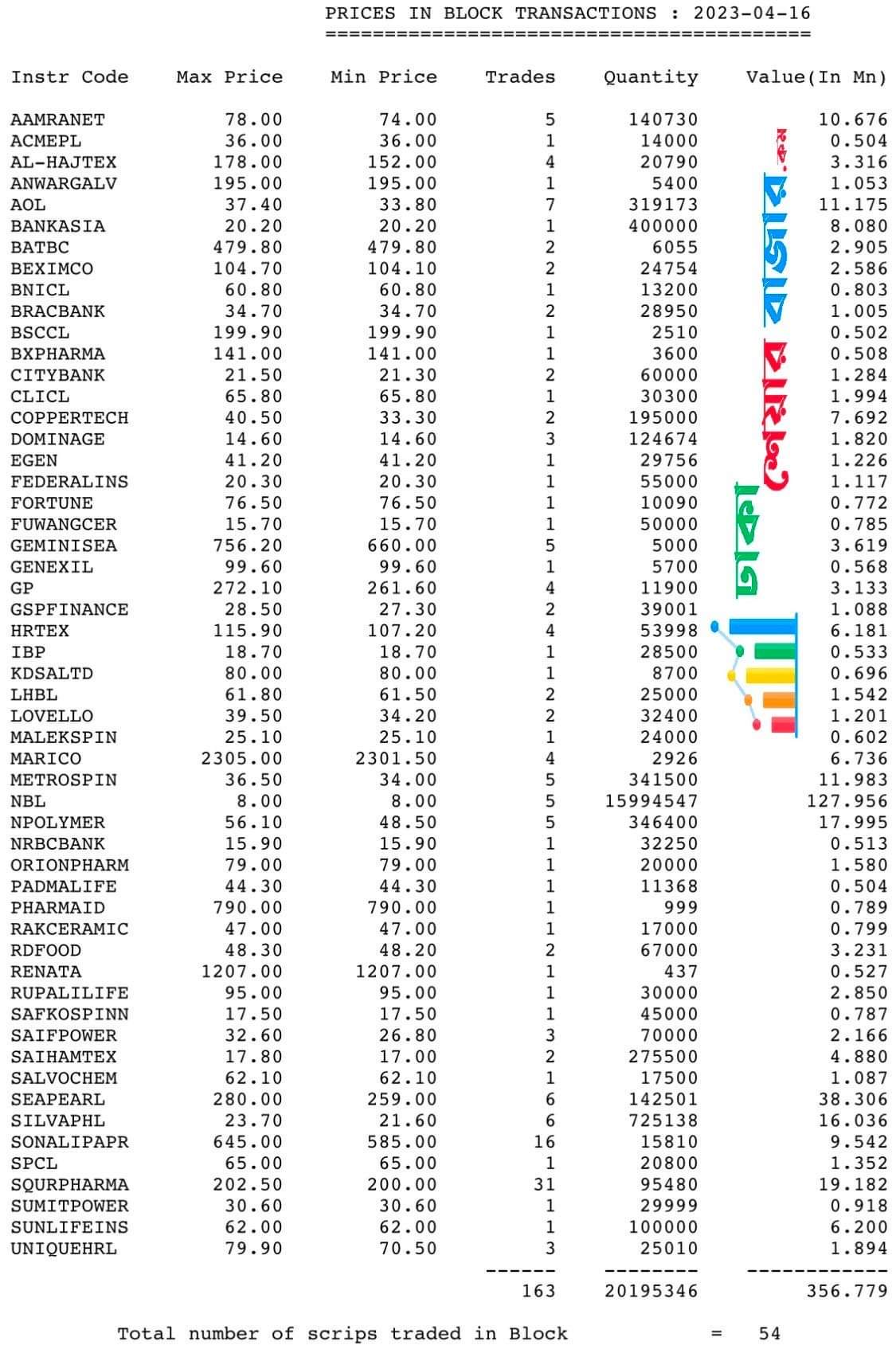 আজ ৫৪ টি শেয়ারের ব্লকে মোট লেনদেন হয়েছে ৩৫.৬৭  কোটি টাকা, গতকাল ব্লোকে মোট ৪৮  শেয়ারের ট্রেড হয়েছিল ২৮.৩৯  কোটি টাকা। আজ ব্লকে গত দিনের চাইতে ট্রেড বেশি  হয় .২৮  কোটি টাকা। সে হিসাবে আজকের মূল মার্কেটের লেনদেন হয়েছে ৪৩৭.২৪   কোটি টাকা, যা গতকাল ছিল ৩৮৫.৭৪  কোটি টাকা। সে হিসাবে আজ গতকালের চেয়ে মূল মার্কেটে লেনদেন বেশি হয়েছে ৫১.৫০  কোটি টাকার।