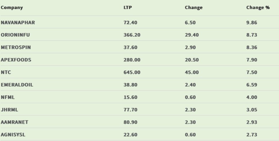 আজ সিএসইতে আজ দাম বৃদ্ধির শীর্ষে থাকা তালিকায় বিভিন্ন খাতের শেয়ার উঠে এসেছে।  আজ দাম বাড়ার শীর্ষে অনেক দিন পরে ফার্মাসিউটিক্যালস  খাতের টি শেয়ার উঠেএসেছে,আজ নাভানা ফার্মাসিউটিক্যালস লিমিটেড দাম বৃদ্ধির শীর্ষ তালিকায় ছিল।