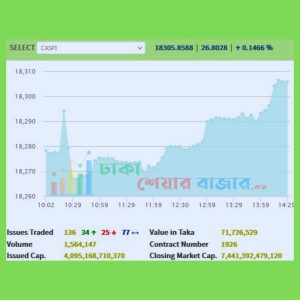উল্লেখ্য, উভয় স্টক একচেঞ্জে আজ দিনের শেষ ভাগে বাজারে বেশ ক্রয়ের চাপ ছিল বলে অভিমত দিয়েছেন শেয়ার সংশ্লিষ্ট বিভিন্ন হাউজের অফিসার ও বিনিয়োগকারীরা।
