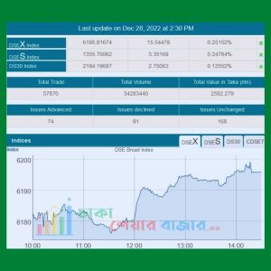 আজ ২৮ ডিসেম্বর ২০২২ ,বুধবার দেশের প্রধান পুঁজিবাজার ঢাকা স্টক এক্সচেঞ্জে (ডিএসই) মূল্য সূচক ইতিবাচক বাচক থাকলেও লেনদেন কম হয়েছে। আজ ডিএসইতে টাকার অংকে লেনদেন গতদিনের চেয়েও কমেছে। আজ ডিএসইতে মোট লেনদেন হয়েছে ২৫৮.২২ কোটি টাকার শেয়ার।
