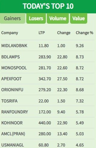 আজ সিএসইতে দাম বৃদ্ধির শীর্ষে থাকা ১০ টি শেয়ার।