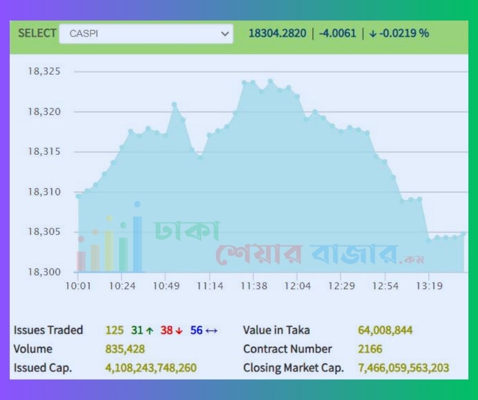 অপরদিকে দেশের ২য় শেয়ার বাজার চট্টগ্রাম স্টক এক্সচেঞ্জের (সিএসই) সূচক শুরুতে ইতিবাচক ধারাতে থাকলেও দিনশেষে নেতিবাচক ধারাতে লেনদেন শেষ হয়েছে। আজ সিএসই সার্বিক সূচক সিএএসপিআই ৩.৫৩ পয়েন্ট কমে সূচক অবস্থান করছে ১৮৩০৪.৭৫ পয়েন্টে।