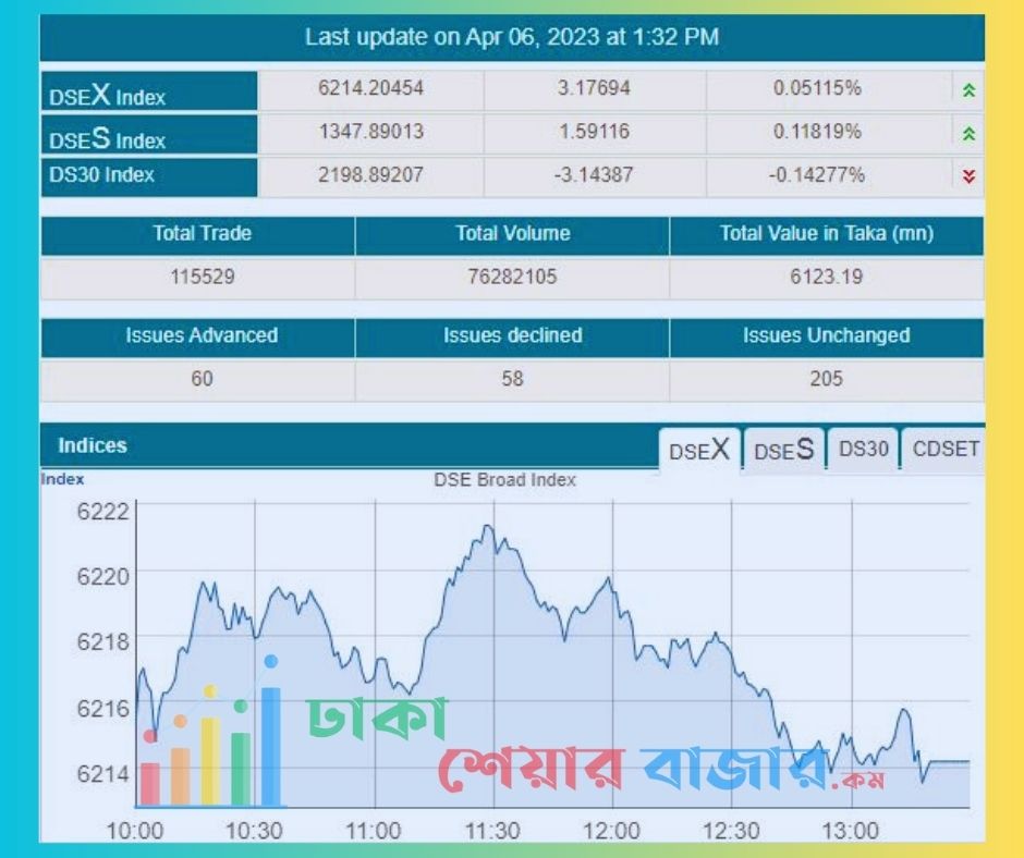 আজ বৃহস্পতিবার ৬ই এপ্রিল ২০২৩, সপ্তাহের শেষ দিন দেশের প্রধান পুঁজিবাজার ঢাকা স্টক এক্সচেঞ্জের লেনদেনের মূল সূচক ডিএসইএক্স সূচক ৩.১৭ পয়েন্ট বেড়ে, অবস্থান করছে ৬২১৪.২০ পয়েন্টে। এছাড়া ডিএসইএস বা শরীয়াহ সূচক ১.৫৯ পয়েন্ট বেড়ে অবস্থান করছে ১৩৪৭.৮৯ পয়েন্টে। ডিএস ৩০ সূচক ৩.১৪ পয়েন্ট কমে দাঁড়িয়েছে ২১৯৮.৮৯ পয়েন্টে।