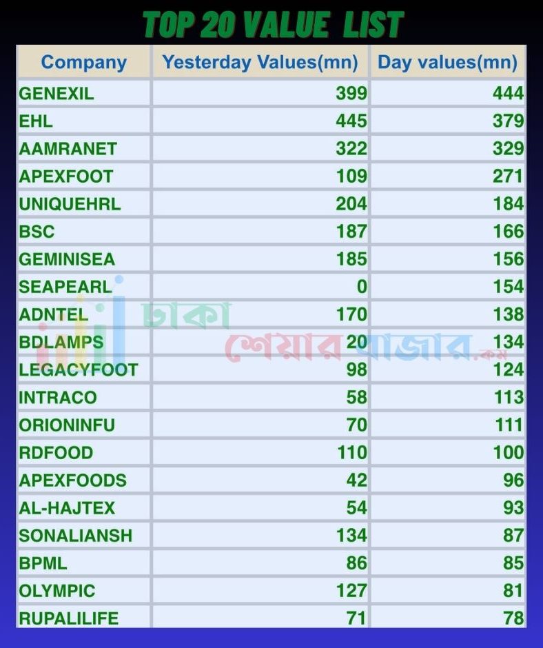 আজ শীর্ষ ২০ (ট্রেড ভ্যালু) লেনদেনের শীর্ষের তালিকায় বিভিন্ন খাতের শেয়ার ছিল। আজ শীর্ষ ২০ (ট্রেড ভ্যালু) লেনদেনের শীর্ষের তালিকায় ছিল জেনেক্স ইনফোসিস লিমিটেড ।