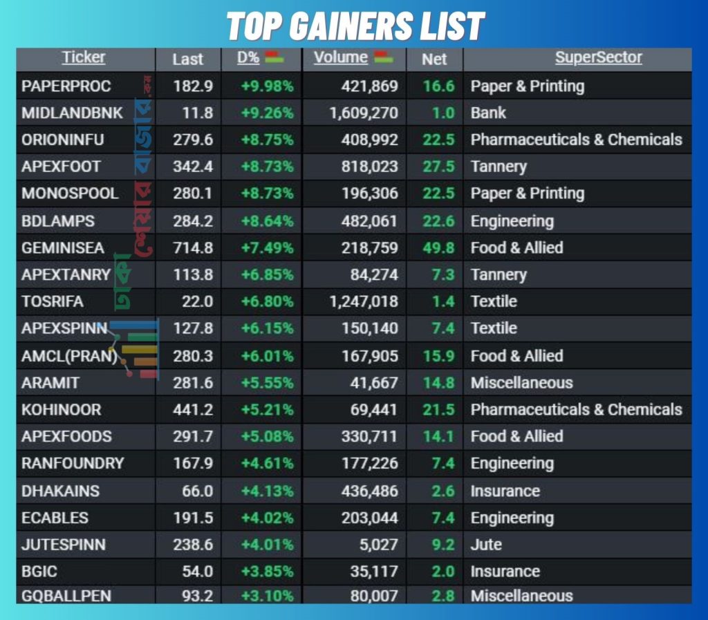 উল্লেখ, আজ অনেক দিন পরে দাম বাড়ার শীর্ষে ২০ তালিকায় এপেক্স গ্রুপের ৪ টি শেয়ার চলে এসেছে। এছাড়া বহুদিন পরে ব্যাংক খাতের একটি শেয়ার টপ গেইনিং তালিকাতে এসেছে। আজ দাম বৃদ্ধির শীর্ষ তালিকার প্রথমেই ছিল পেপার প্রসেসিং লিমিটেড।