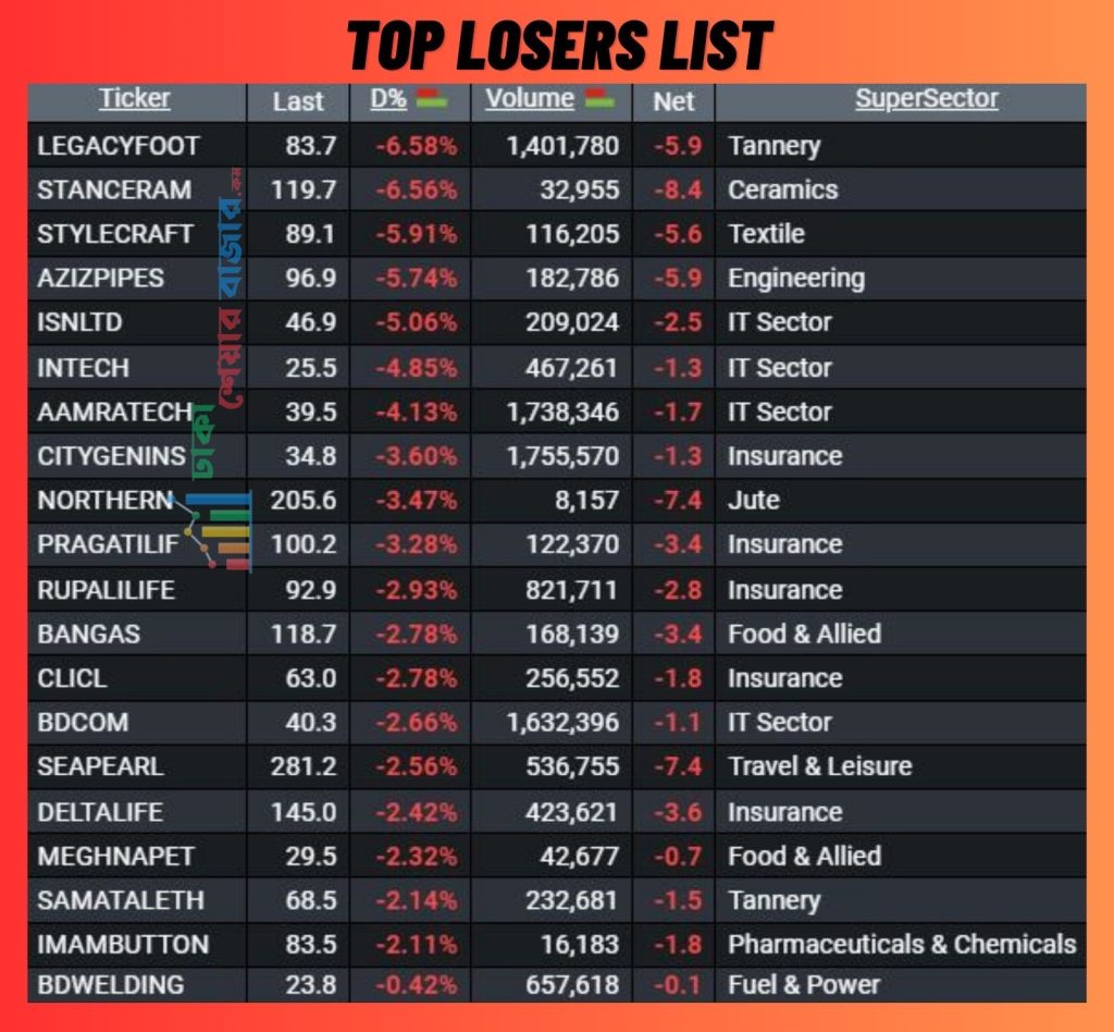 আজ শীর্ষ ২০ দাম কমার শীর্ষ তালিকায় ৯ টি খাতের শেয়ার ছিল। আজ যে সব শেয়ার কমার তালিকায় ছিল, সে গুলোর বেশ কয়েকটি গতকাল দাম বৃদ্ধির শীর্ষে ছিল। আজ দাম কমার শীর্ষ তালিকার প্রথমে ছিল লিগেছি ফুটওয়ার।