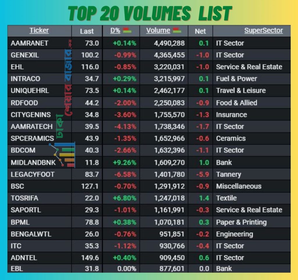 আজ শীর্ষ ২০ (ভলিউম) শেয়ারের সংখ্যার দিক দিয়ে লেনদেনে বিভিন্ন খাতের শেয়ার ছিল। আজ টপ ২০ শেয়ার সংখ্যার (ভলিউম) দিক দিয়ে প্রথমে ছিল আইটি খাতের আমার নেটওয়ার্কস লিমিটেড। গতকালও শেয়ারটি প্রথম তালিকায় ছিল।