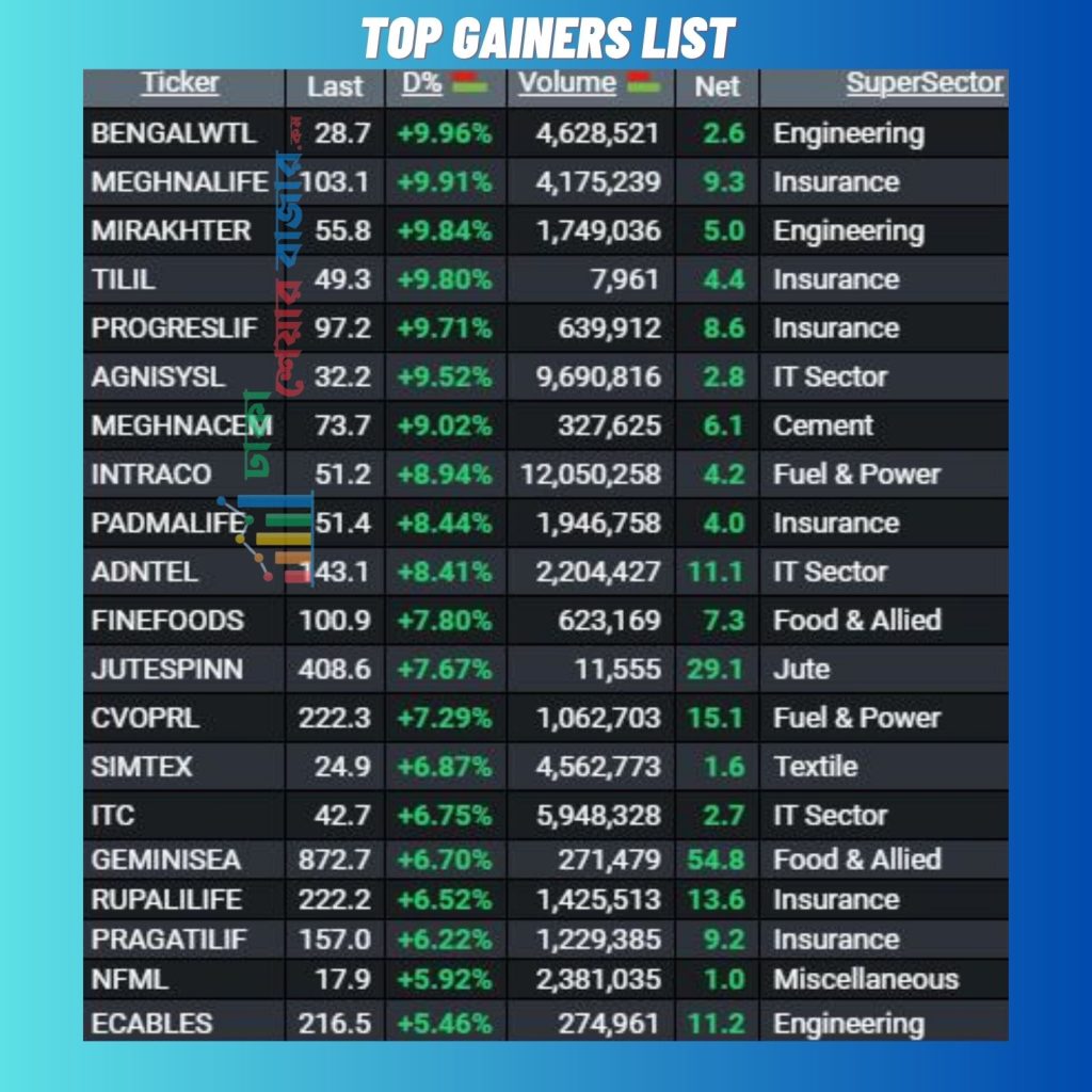 আজ দাম বৃদ্ধির শীর্ষ তালিকায় ৯ টি খাতের শেয়ার থাকলে ও আজ ডিএসইর দাম বৃদ্ধির শীর্ষ তালিকায় লাইফ ইন্সুইরেন্স ও আইটি খাতের আধিপত্য দেখা গেল।