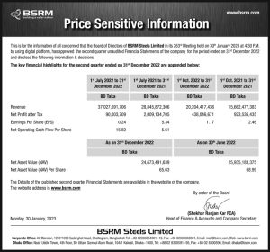 পুঁজিবাজারে তালিকাভুক্ত ইঞ্জিনিয়ারিং খাতের কোম্পানি বিএসআরএম স্টিলস লিমিটেড (BSRMSTEEL)এর চলতি অর্থবছরের ২য় প্রান্তিকের (অক্টোবর ‘২০২২-ডিসেম্বর’২০২২) ও (জুলাই ‘২০২২-ডিসেম্বর’২০২২) অনিরীক্ষিত আর্থিক প্রতিবেদন প্রকাশ করেছে।