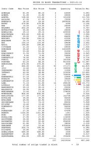 আজ মঙ্গলবার, ১০ জানুয়ারী ২০২৩, দেশের প্রধান শেয়ার বাজার ঢাকা ষ্টক এক্সচেঞ্জে ব্লকে ৫৯ টি শেয়ারের মোট লেনদেন হয়েছে ৪৮.৭২ কোটি টাকা।