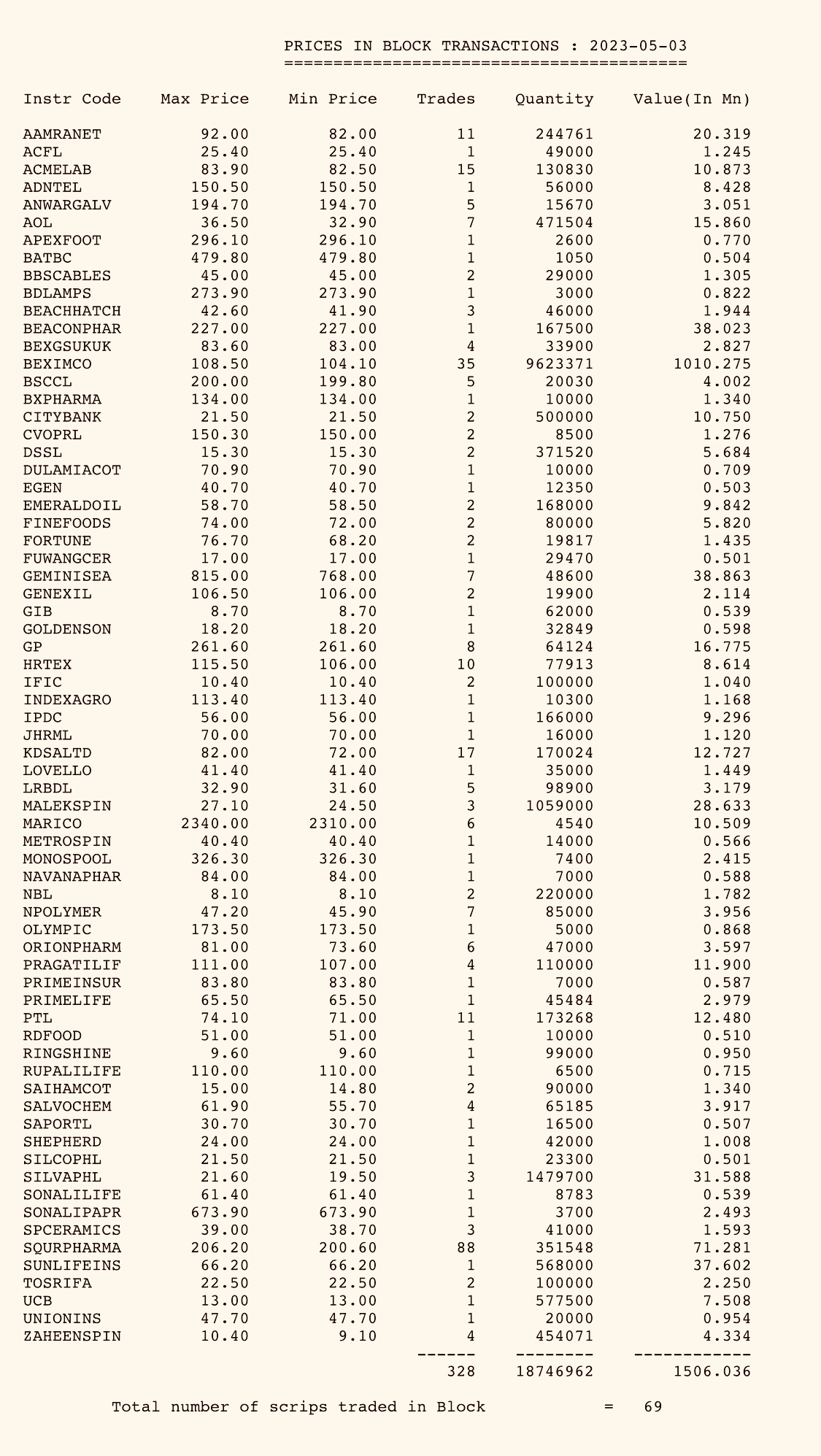 আজ বুধবার ৩ রা মে,২০২৩ দেশের প্রধান পুঁজিবাজার ঢাকা ষ্টক এক্সচেঞ্জে ব্লকে ৬৯টি শেয়ারের মোট লেনদেন হয়েছে ১৫০.৬০ কোটি টাকা। গতকাল ব্লকে মোট ৭০ টি কোম্পানির লেনদেন হয়েছিল ১৩৯.১০ কোটি টাকা। আজ ব্লকে গত দিনের চেয়ে লেনদেন বেশি হয়েছে ১১.৫০ কোটি টাকার।