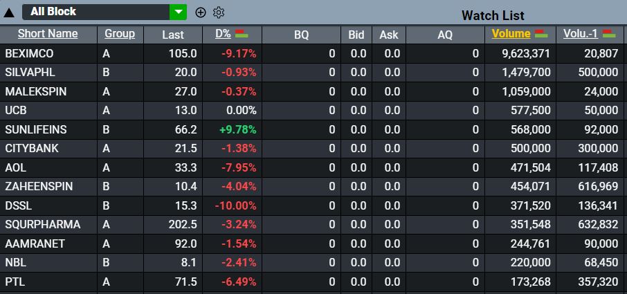 আজকের ব্লক মার্কেটে ভলিউমের দিক দিয়ে সবচেয়ে বেশি লেনদেন হয়েছে বিবিধ খাতের কোম্পানি বেক্সিমকো লিমিটেডের (BEXIMCO) লেনদেন হয়েছে ৯৬.২৩ লাখ,এর এর পরেই বেশি লেনদেন হয়েছে সিলভা ফার্মার ১৪.৭৯ লাখ,মালেক স্পিনিং এর ১০.৫৯ লাখ,ইউনাইটেড কমার্শিয়াল ব্যাংকের লেনদেন হয়েছে ৫.৭৭ লাখ ও সানলাইফ ইন্সুরেন্স এর লেনদেন হয়েছে ৫.৬৮ লাখ শেয়ারের।