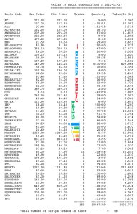আজ ২৭ ডিসেম্বর, মঙ্গলবার ঢাকা স্টক এক্সচেঞ্জ ৫৮ টি শেয়ারের  ব্লকে মোট লেনদেন হয়েছে ১৪০.১৭  কোটি টাকা।