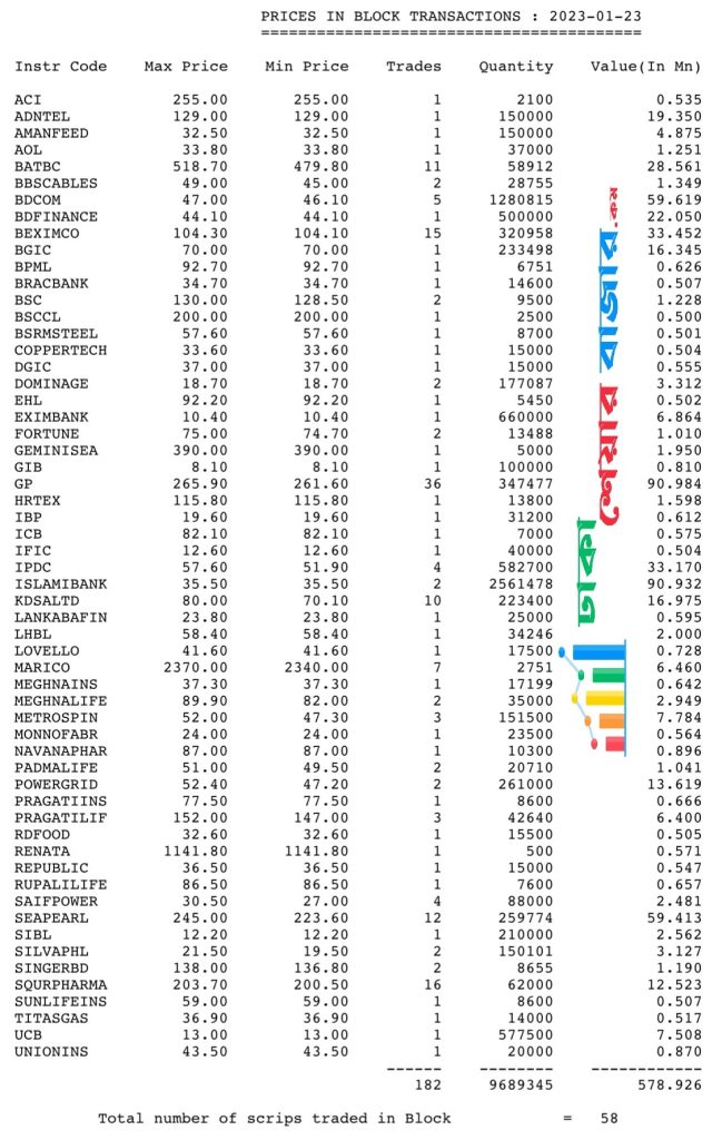 আজ ২৩ জানুয়ারী ২০২৩, দেশের প্রধান শেয়ার বাজার ঢাকা ষ্টক এক্সচেঞ্জে ব্লকে ৫৮ টি শেয়ারের মোট লেনদেন হয়েছে ৫৭.৮৯ কোটি টাকা। গতকাল ব্লকে মোট ৬৫ টি কোম্পানির ট্রেড হয়েছে ৫৮.৪৬ কোটি টাকা। আজ ব্লকে গত দিনের চেয়ে লেনদেন কম হয়েছে ০.৫৭ কোটি টাকা।