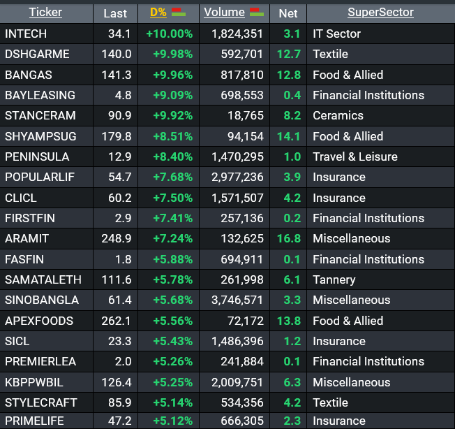 আজ ঢাকা স্টক এক্সচেঞ্জে মূল্যবৃদ্ধির শীর্ষে ছিল ইনটেক লিমিটেড। তালিকায় দ্বিতীয় স্থানে ছিল দেশ গার্মেন্টসতৃতীয় স্থানে ছিল বঙ্গজ লিমিটেড।