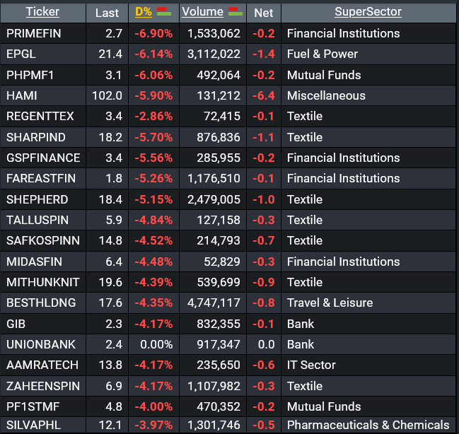 আজ ঢাকা স্টক এক্সচেঞ্জে মূল্যহ্রাসের শীর্ষে ছিল প্রাইম ফাইন্যান্স ।দরপতনের তালিকায় দ্বিতীয় স্থানে রয়েছে এনার্জিপ্যাক পাওয়ার জেনারেশন পিএলসি.।তৃতীয় স্থানে ছিলপিএইচপি ফার্স্ট মিউচুয়াল ফান্ড