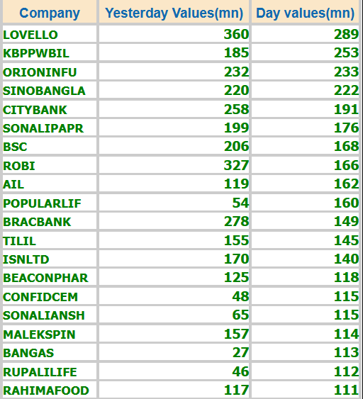 আজ লেনদেনের (টাকার অংকে) শীর্ষে উঠে এসেছে শীর্ষে উঠে এসেছে তৌফিকা ফুডস অ্যান্ড লাভেলো আইস-ক্রিম পিএলসি। দ্বিতীয় স্থানে উঠে এসেছে খান ব্রাদাস্‌ পি.পি. ওভেন ব্যাগ ইন্ডাস্ট্রিজ লিমিটেড এবং তালিকার তৃতীয় স্থানে উঠে এসেছে ওরিয়ন ইনফিউশন লি.।