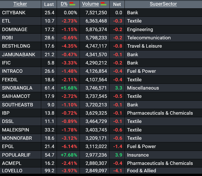আজ লেনদেনের (শেয়ারের সংখ্যার দিক দিয়ে) শীর্ষে উঠে এসেছে শীর্ষে উঠে এসেছে সিটি ব্যাংক পিএলসি। দ্বিতীয় স্থানে উঠে এসেছে ইভেন্স টেক্সটাইল লিমিটেড এবং তালিকার তৃতীয় স্থানে উঠে এসেছে ডমিনেজ স্টিলের.।