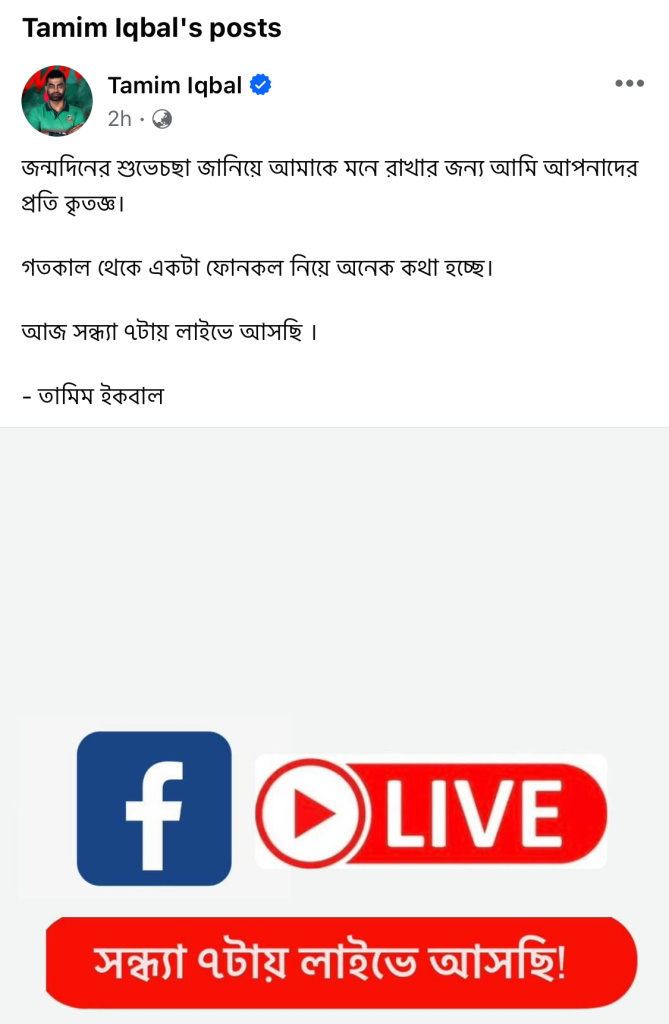 তামিম সেই পোস্টে লেখেন, জন্মদিনের শুভেচ্ছা জানিয়ে আমাকে মনে রাখার জন্য আমি আপনাদের প্রতি কৃতজ্ঞ। গতকাল (মঙ্গলবাব) থেকে একটা ফোন কল নিয়ে অনেক কথা হচ্ছে। আজ সন্ধ্যা ৭টায় লাইভে আসছি।