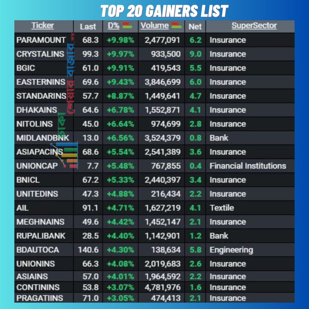 আজ দাম বৃদ্ধির শীর্ষ ১০ তালিকার টি ছিল ইন্সুরেন্স খাতের শেয়ার।