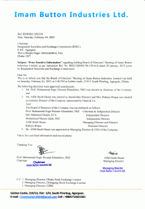 পুঁজিবাজারে তালিকাভুক্ত ফার্মাসিটিউক্যালস খাতের কোম্পানি ইমাম বাটন ইন্ডাস্ট্রিজ লিমিটেড (IMAMBUTTON) এর চেয়ারম্যানের নির্বাচন এবং ব্যবস্থাপনা পরিচালক ও প্রধান নির্বাহী কর্মকর্তা নিয়োগ দেয়া হয়েছে।