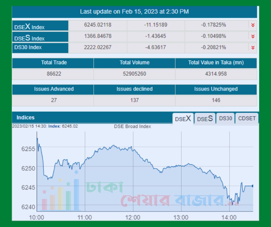 আজ ১৫ই ফেব্রুয়ারী ২০২৩, সপ্তাহের ৩য় দিন উভয় স্টক এক্সচেঞ্জের সূচক কমেছে, তবে লেনদেন ঢাকায় কমলেও বেড়েছে চট্রগ্রামে।