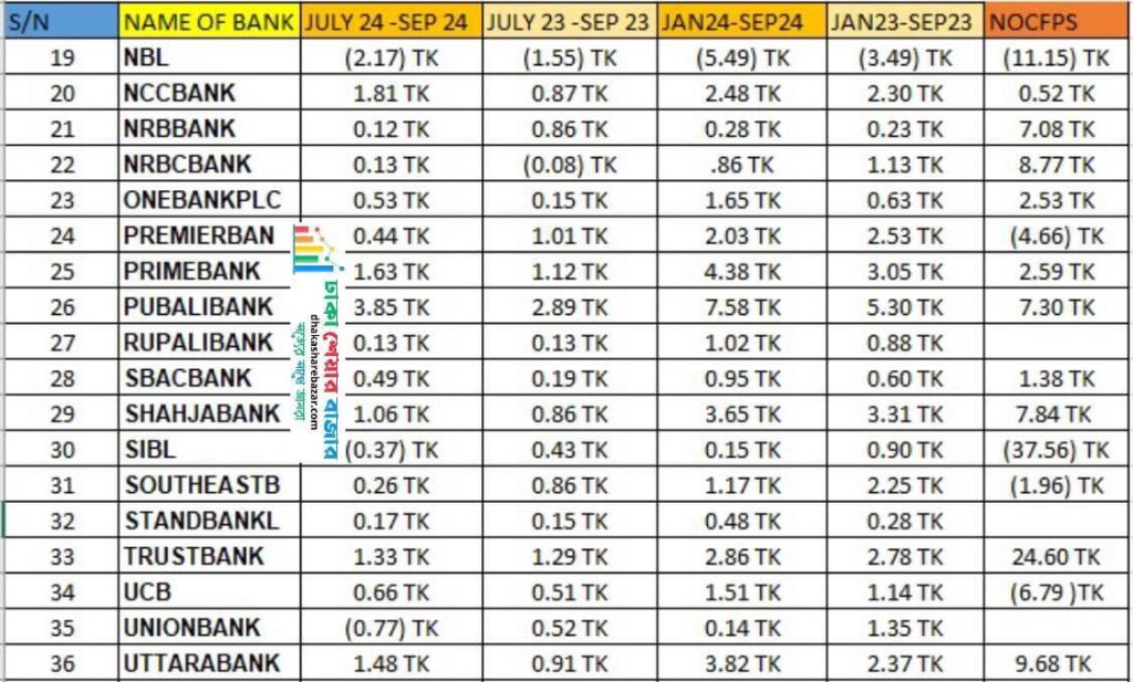 ৩৫ টি ব্যাংকের মধ্যে ১৮ টি ব্যাংকের গত বছরের চেয়ে তৃতীয় প্রান্তিকে তথা ৯ মাসে আয় (ইপিএস) বেড়েছে। বাকি ১৭ টি ব্যাংকের মধ্যে গত বছরের চেয়ে আয় (ইপিএস) কিছুটা কমেছে ১৪ টি ব্যাংকের এবং ৩ টি ব্যাংক তৃতীয় প্রান্তিকে লোকসানে পরেছে, যা গত বছরের চেয়ে ও বেশি লোকসান করেছে।