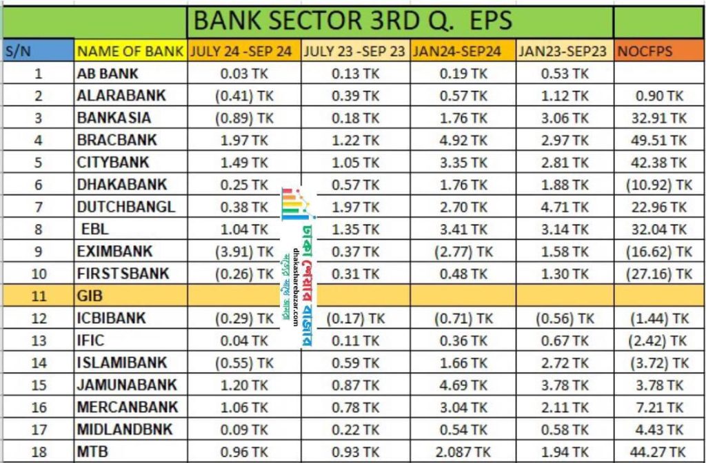 দেশের শেয়ার বাজারে ব্যাংক খাতে ৩৬ টি ব্যাংক তালিকাভুক্ত রয়েছে। ৩৬ টি ব্যাংকের মধ্যে ইতিমধ্যেই ৩৫ টি ব্যাংক তৃতীয় প্রান্তিক ইপিএস ঘোষণা করেছে। শুধুমাত্র গ্লোবাল ইসলামী ব্যাংক এখনো তৃতীয় প্রান্তিক ইপিএস প্রকাশের তারিখ জানায়নি।