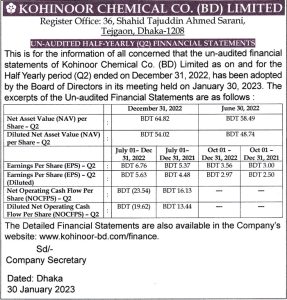 পুঁজিবাজারে তালিকাভুক্ত ফার্মা খাতের কোম্পানি কোহিনুর ক্যামিকেল লিমিটেড (KOHINUR)চলতি অর্থবছরের ২য় প্রান্তিকের (অক্টোবর ‘২০২২-ডিসেম্বর’২০২২) ও (জুলাই ‘২০২২-ডিসেম্বর’২০২২) অনিরীক্ষিত আর্থিক প্রতিবেদন প্রকাশ করেছে।