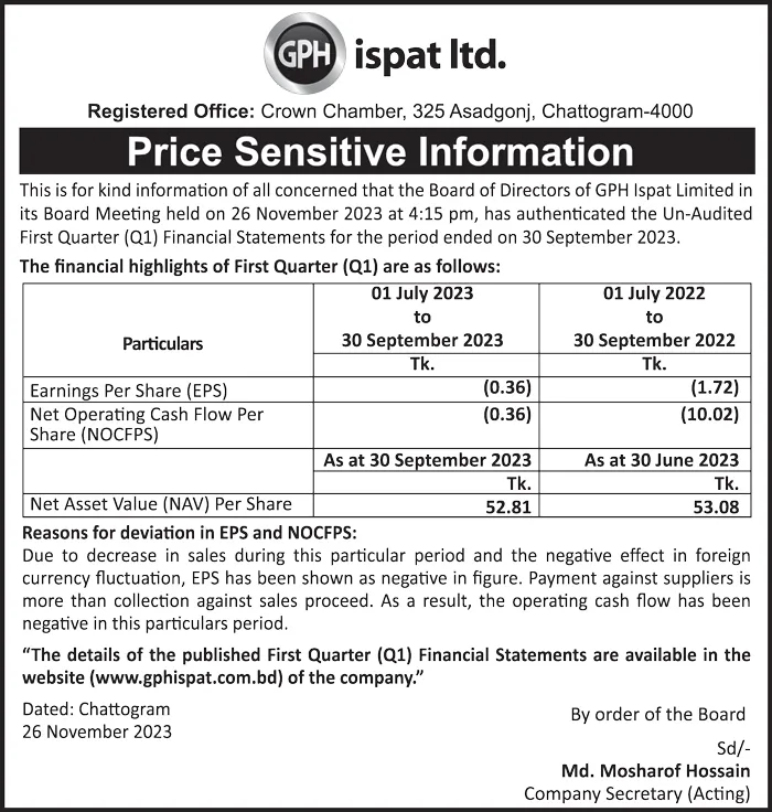 পুঁজিবাজারে তালিকাভুক্ত প্রকৌশল খাতের কোম্পানি জিপিএইচ ইস্পাত লিমিটেড কোম্পানি (GPHISPAT) চলতি অর্থ বছরের প্রথম প্রান্তিকের (জুলাই ২০২৩– সেপ্টেম্বর২০২৩) অনিরীক্ষিত আর্থিক প্রতিবেদন প্রকাশ করেছে।